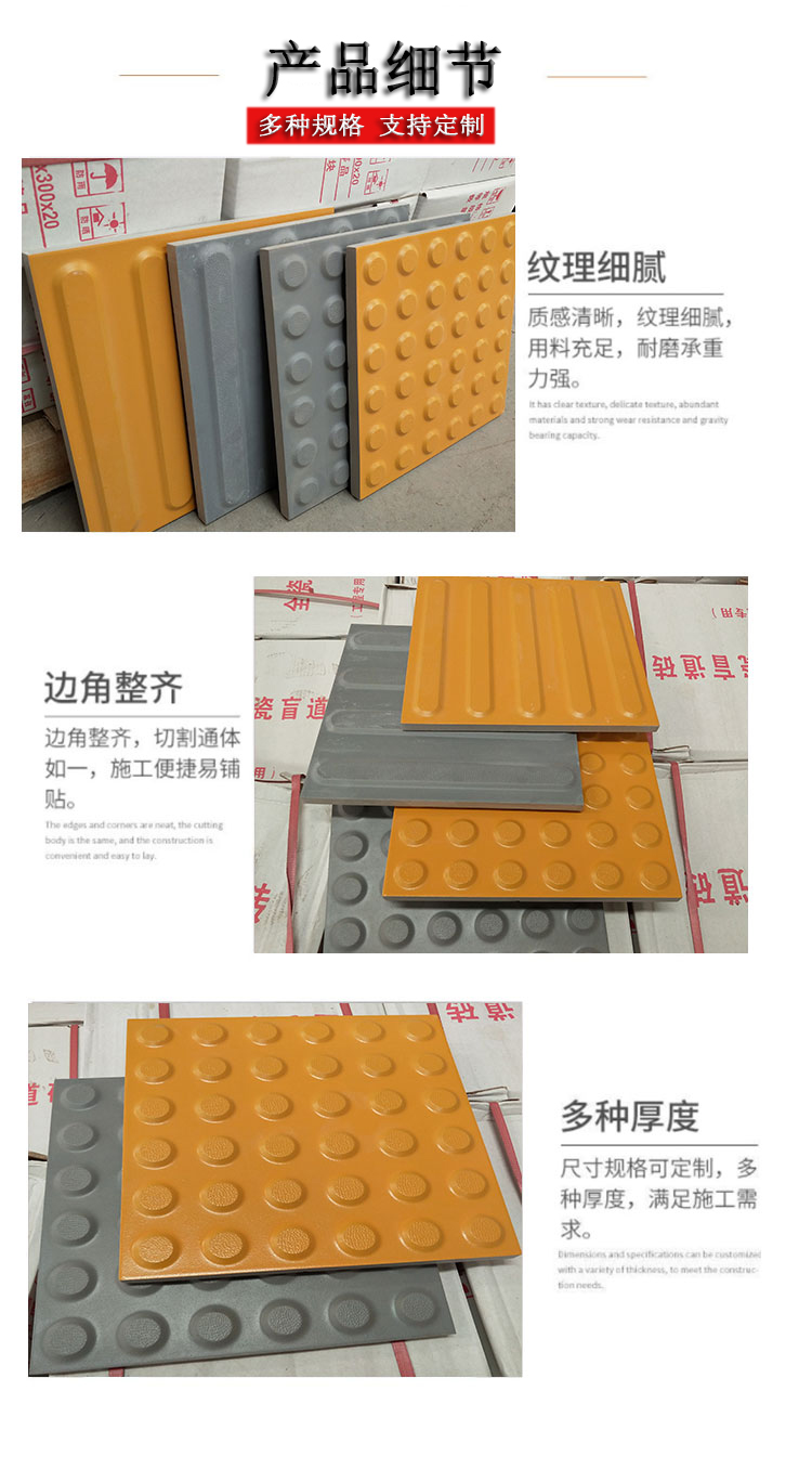 描述:全瓷盲道磚可分為兩種類型: 1:直條狀凸起磚,用于鋪直道,直條突起指向盲道方向,也就是走的時候沿著直條突起走。每條高出地面5mm,寬度宜為0.3-0.6m,可使盲杖和腳底產(chǎn)生感覺,便于指引視力殘疾者...